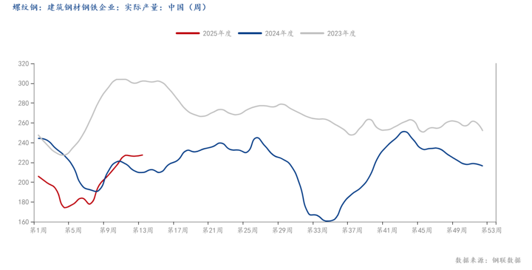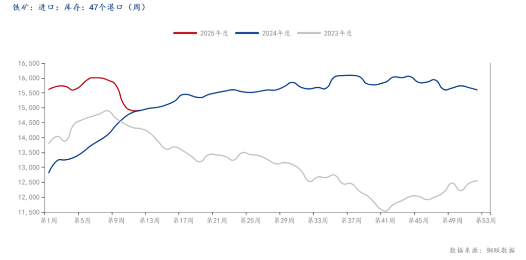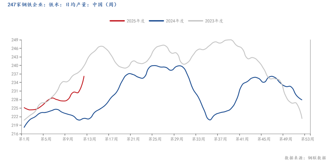 如圖所示,我網(wǎng)對(duì)47港口庫存進(jìn)行調(diào)研,本期47港口鐵礦庫存周環(huán)比小幅增加,且?guī)齑嫠教幱谙鄬?duì)高位。從需求端看,鐵水產(chǎn)量亦呈現(xiàn)增勢(shì),截止發(fā)稿,全國247家樣本鋼廠的日均鐵水產(chǎn)量為237.28萬噸,環(huán)比上周增加1.02萬噸,鋼廠仍處于增產(chǎn)階段。數(shù)據(jù)表明,鐵水產(chǎn)量自2025年2月底以來持續(xù)呈現(xiàn)回升態(tài)勢(shì),且增速顯著加快,而當(dāng)前鐵水產(chǎn)量處于加速復(fù)蘇通道,全國鐵水日均產(chǎn)量同比增幅顯著,且鋼廠盈利率與高爐開工率同步改善。短期內(nèi),需求回暖與利潤修復(fù)仍是核心驅(qū)動(dòng),而隨著成材端社會(huì)庫存逐步去化,預(yù)計(jì)短期內(nèi)鐵水產(chǎn)量或維持增勢(shì),但整體產(chǎn)量增幅或有所放緩。